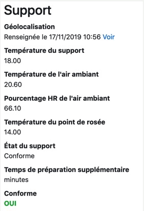 - Relevé des conditions climatiques (T°C support, Température air ambiant, %humidité relative de l’air, T°C du point de rosée)