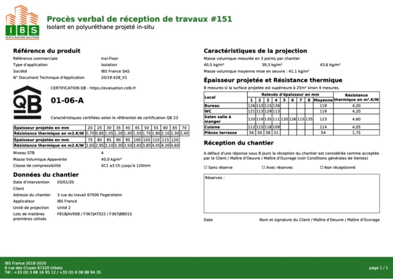 L’application mobile IBS France permet à l’applicateur d’éditer automatiquement un PV de réception ainsi qu’un rapport de chantier comprenant l’ensemble des informations récoltées (photos, contrôles, relevé d’épaisseur etc…) pendant le chantier ainsi que les résultats des contrôles de performances réalisés dans un laboratoire du groupe IBS France.