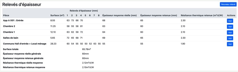 - Relevé d’épaisseur et surface projetée pièce par pièce