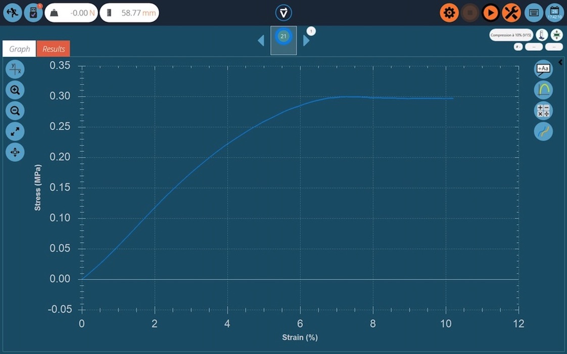 L’éprouvette est compressée à par le banc d’essai. La valeur de la force nécessaire pour compresser l’éprouvette à 10% de son épaisseur représente la résistance en compression si l’essai parvient à son terme.