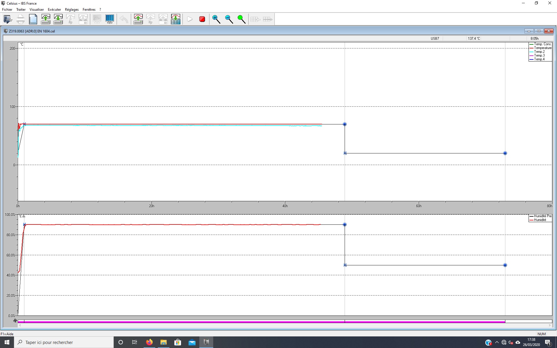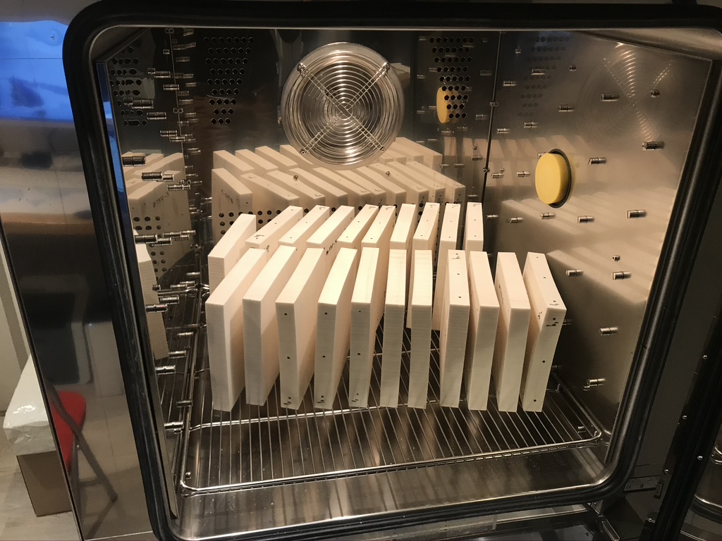 Elles sont ensuite introduites dans l’enceinte climatique dont un programme leur fait subir un traitement à 70°C et 90% d’Humidité Relative pendant 48h avant de les stabiliser pendant 24h à 20°C et 50% d’Humidité Relative.