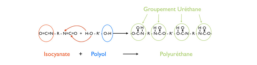 La réaction menant à la formation des polyuréthanes est issue du mélange entre un polyol (possédant des fonctions alcool noté -OH) et d’un isocyanate (possédant des fonctions notées NCO).